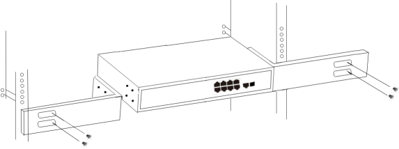1. 用包装箱内附带的机架安装螺丝钉将专用机架角铁牢固的安装到交换机的两侧。