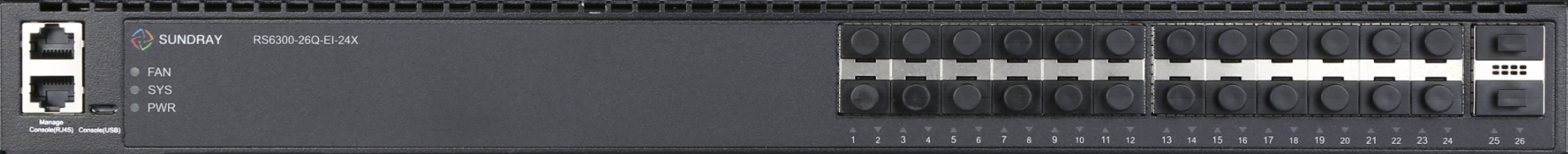 RS6300-26Q-EI-24X 以太网交换机前面板提供了 24 个 SFP+ 10G 光口,2 个 40G