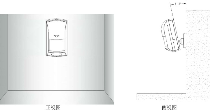第五步,调整产品位置与墙壁呈 5-15°夹角, 安装后需要根据实际人体移动检测后进行角度优化调整以达到最佳检测效果。