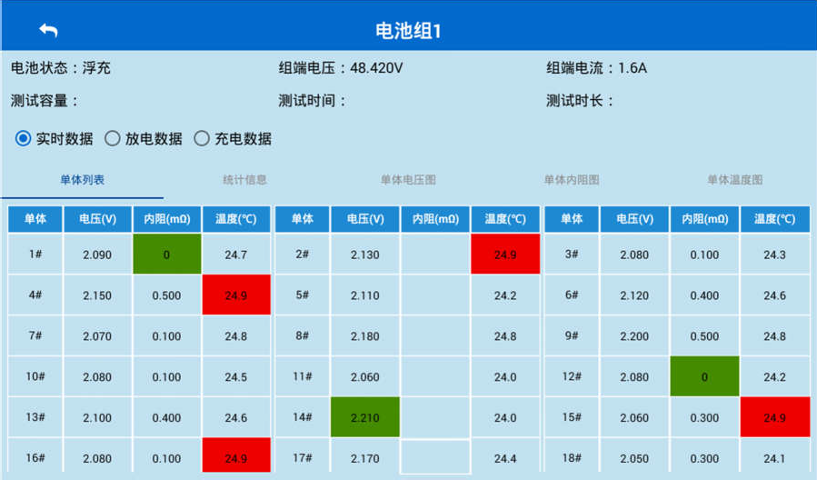点击相应电池组列表界面名称,即可进入蓄电池组实时数据界面,就可以对当前电池组的状态、组端电压、电流、单体电压、单体温度为数据信息进行监测,并且可以切换查看数据图形显示,同时还可以切换查看历史的放电数据和充电数据。