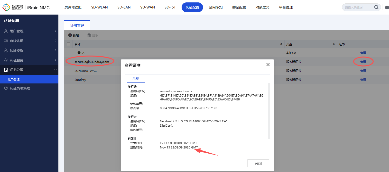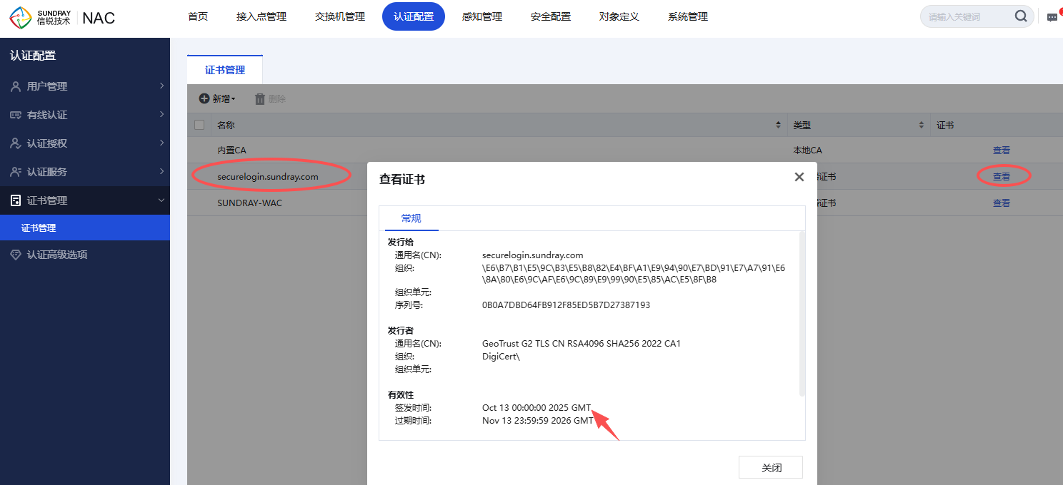 证书更新后,需要在控制器界面进行确认证书更新结果。可以点击控制器界面证书管理查看证书有效期是否到2026年11月。