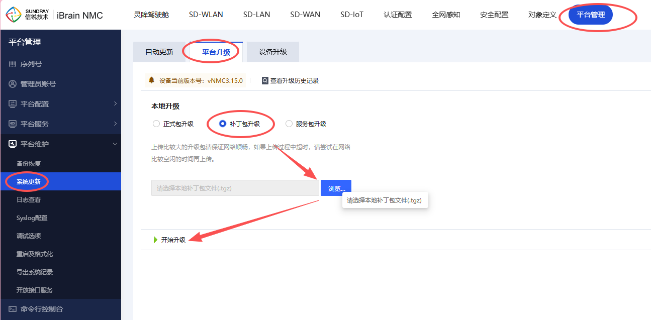 (1)升级中心端:登录中心端控制台,升级KB包;【平台管理】-【平台维护】-【系统更新】-【平台升级】