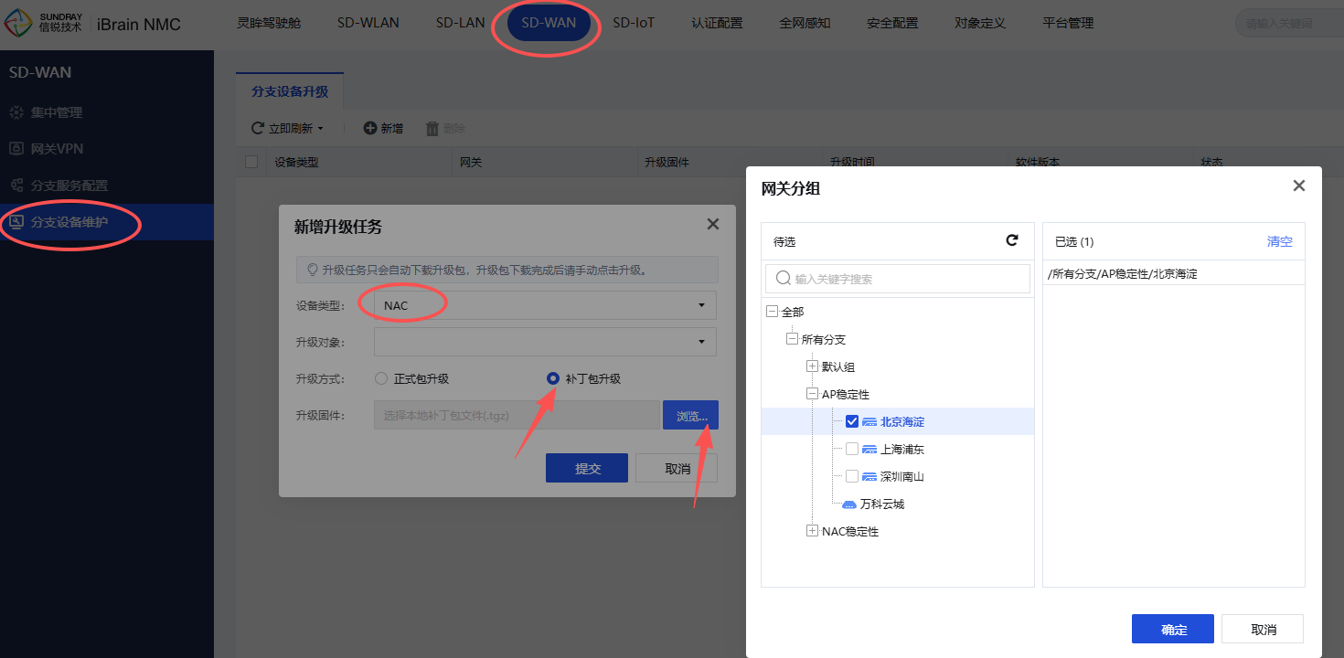 (2)升级分支:分支必须在线才支持下发KB包升级;【SD-WAN】-【分支设备维护】新增升级任务,选择NAC设备类型,选择要下发KB包的分支,上传KB包升级。