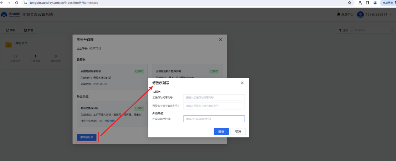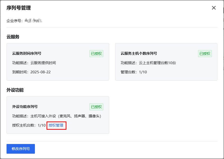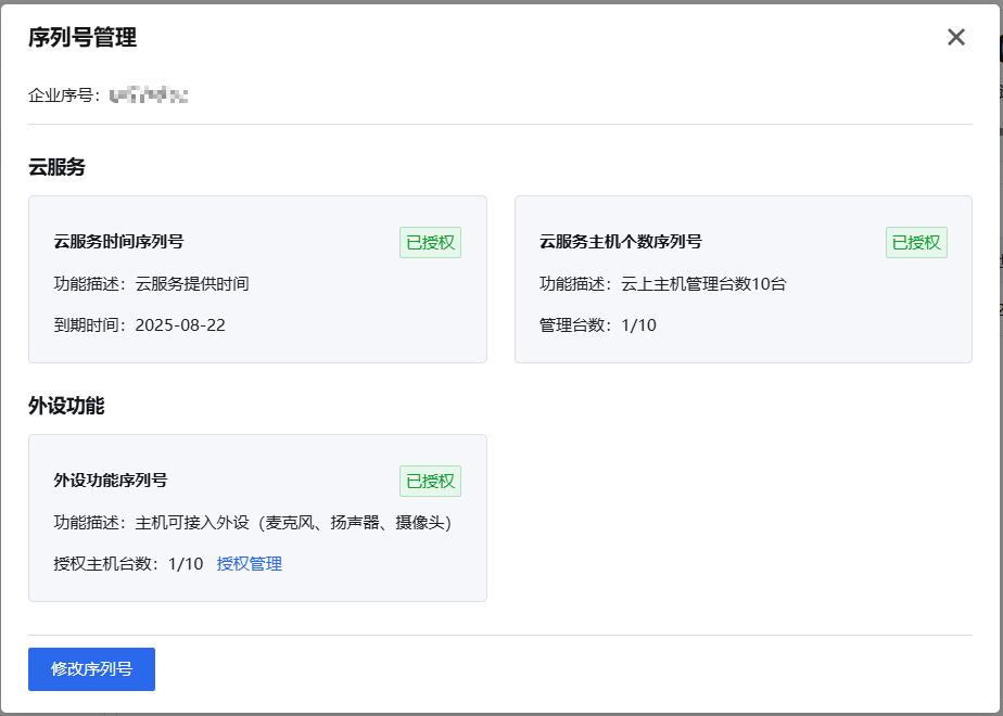 1)对当前账号的云服务时间序列号、主机管理个数序列号、外设功能序列号的进行查看和管理。
