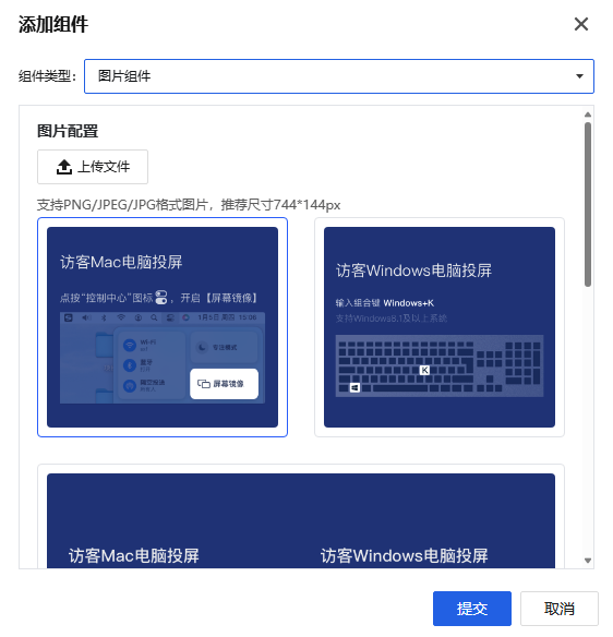 自适应引导布局:可根据实际需求自主选择是否展示手机或电脑的投屏指引。在电脑投屏场景中,系统将智能识别会议室主机的状态,并据此自动调整投屏指引内容,以确保用户能够顺利完成投屏操作,提升会议效率,配置该类型布局的模板后续绑定策略时可配置员工、访客网络和应急网络,支持编辑员工、访客的投屏操作内容