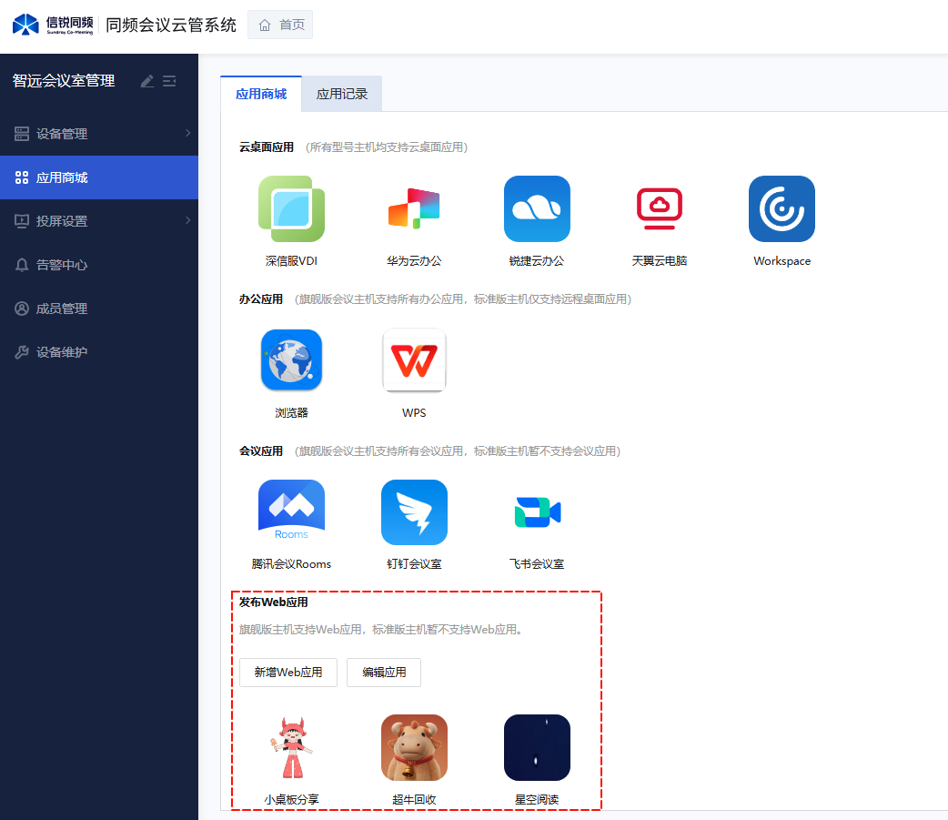 (2)不同型号会议主机支持应用有所不同,当一个策略中有不同型号主机时,提交会有不支持应用的提示,应用支持参考如下表格