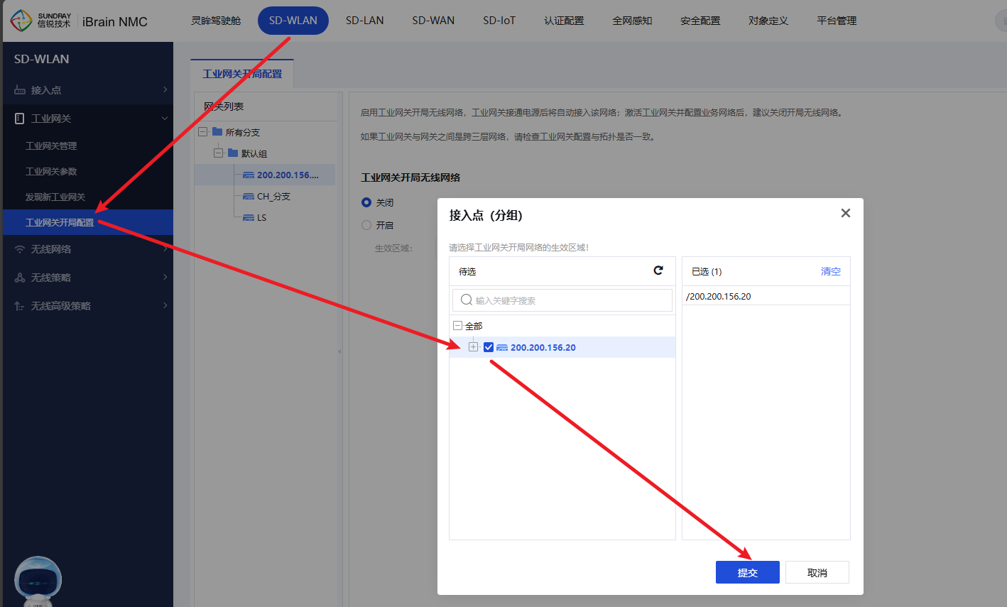 4、打开工业网关开局无线网络,引用分支NAC上的AP1和AP2