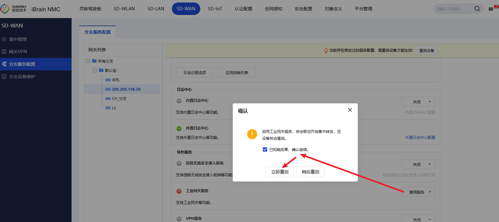 2、分支服务配置页面,开启对应分支NAC的工业网关服务,重启设备