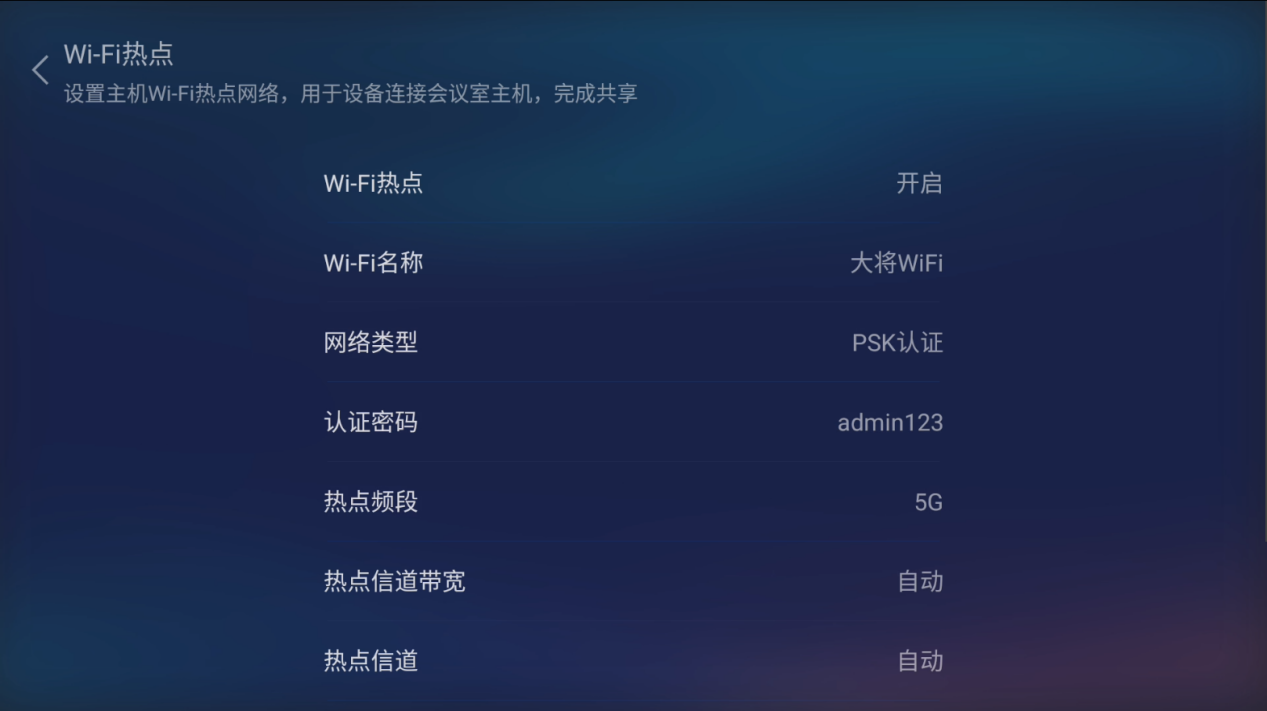 会议主机必须开启WiFi热点,且WIFI热点必须是PSK认证方式,不能设置为开放式。建议使用5GHz频段。