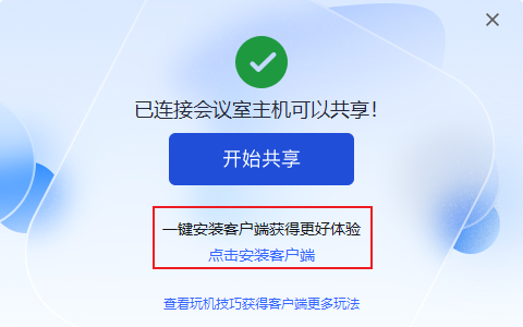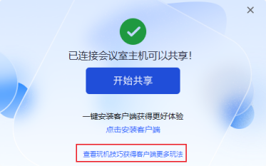 2、等待托盘弹窗提示已连接成功,此时点击托盘弹窗的开始共享,或按下投屏器上按键进行投屏。