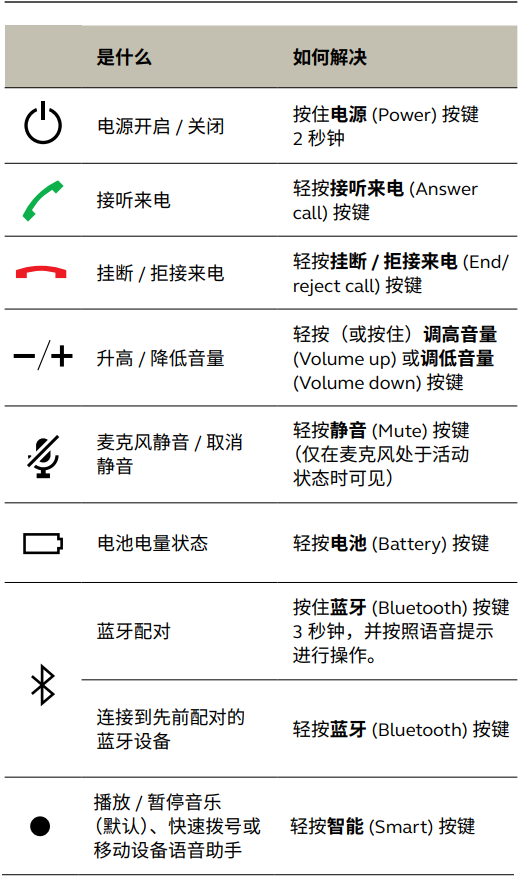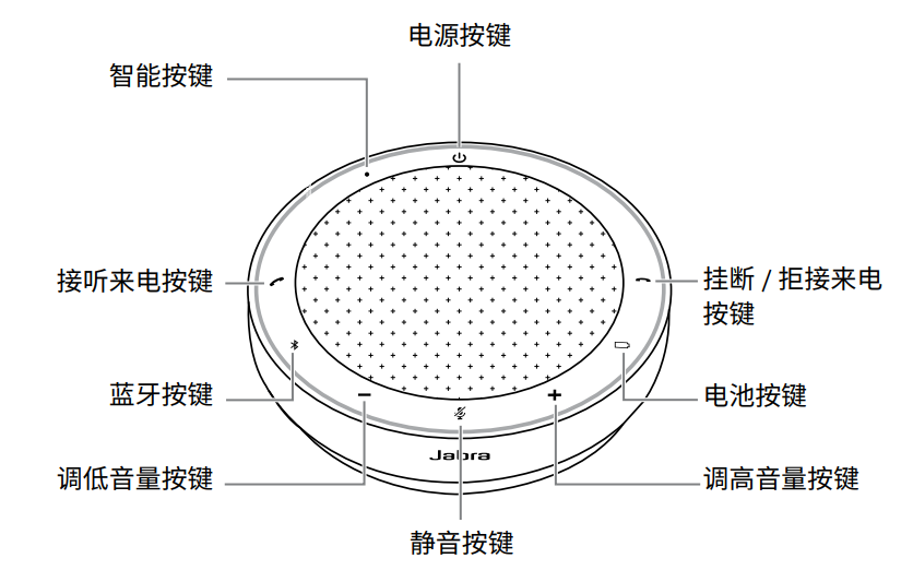 按键为背光式,只有当全向麦电源开启时才可见。电源(Power)按键除外,该按键始终可见。如果超过1分钟不活动,按键灯光将逐渐变暗,您可以轻按按键所在区域来重新激活。智能(Smart)按键和静音(Mute)按键仅在某些情况下可见。