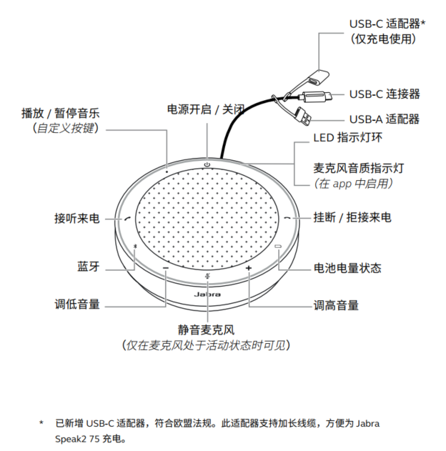全向麦可显示恢复出厂设置、电池电量、配对和蓝牙连接状态。您可以使用Jabra Direct或Jabra Sound+选择提示音或语音通知。