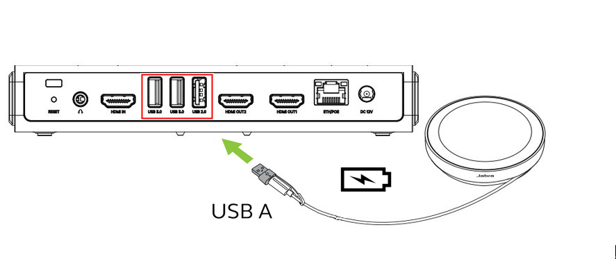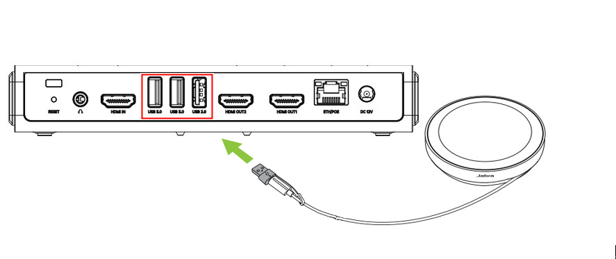 将全向麦插入会议主机的任一USB端口。您可能需要在操作系统音频设置和视频会议工具(MicrosoftTeams、CiscoWebex等)的音频设置中,将Jabra Speak2 75设为播放和录音设备。
