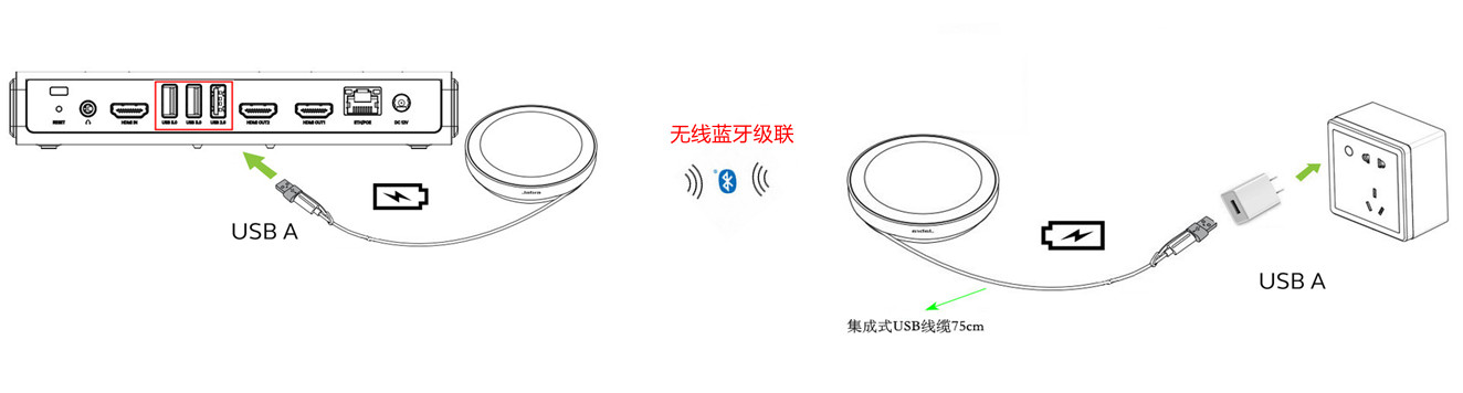 3、两台Speak2 75无线级联时,第二台Speak2 75设备需要额外购买USB C/A充电头(5V 1A),在设备附近提供的插座进行充电(设备集成USB线缆75cm)
