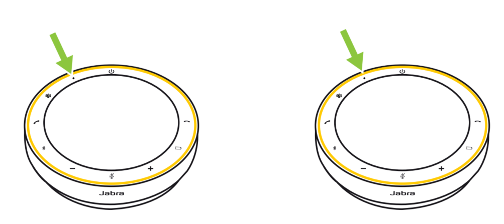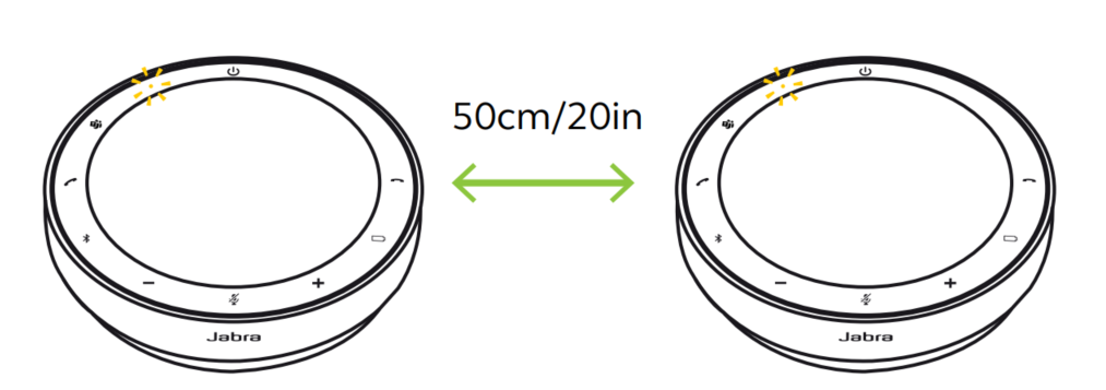 要串联两台 Jabra Speak2 75 设备之间的音频,请打开全向麦并将其放在彼此附近(50 厘米)。当两台全向麦之间的距离为 50 厘米或更短时,两台设备上的 Smart(智能)按键 LED 指示灯都会闪烁黄光。