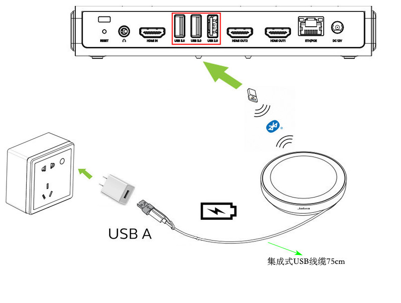 2、当使用蓝牙适配器连接会议主机时,需要额外购买USB C/A充电头(5V 1A),在设备附近提供的插座进行充电(设备集成USB线缆75cm)