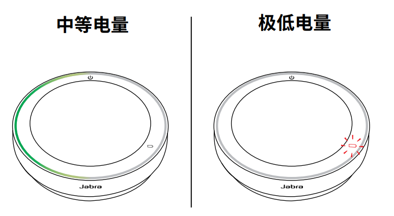 为在断开电源后节省电池电量,如果15分钟内未连接到蓝牙设备,全向麦将关闭电源。如果连接到蓝牙设备但未插入电源,全向麦将在8小时无交互后关闭电源。该设置可在Jabra Direct或Jabra Sound+中配置。