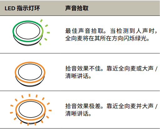 全向麦的LED指示灯将亮起,显示扬声器拾取周围声音的清晰程度。