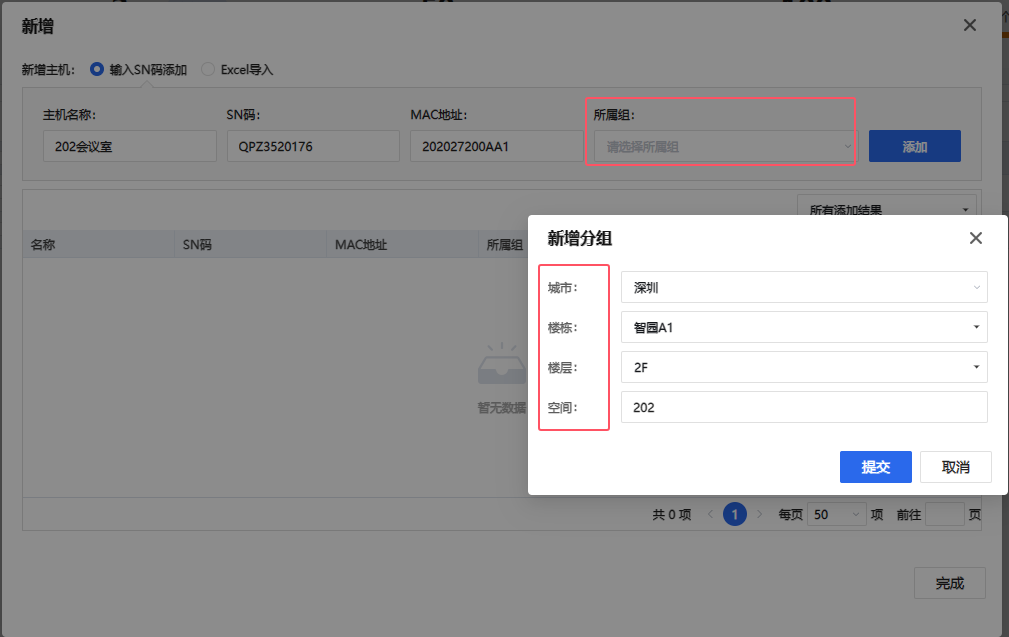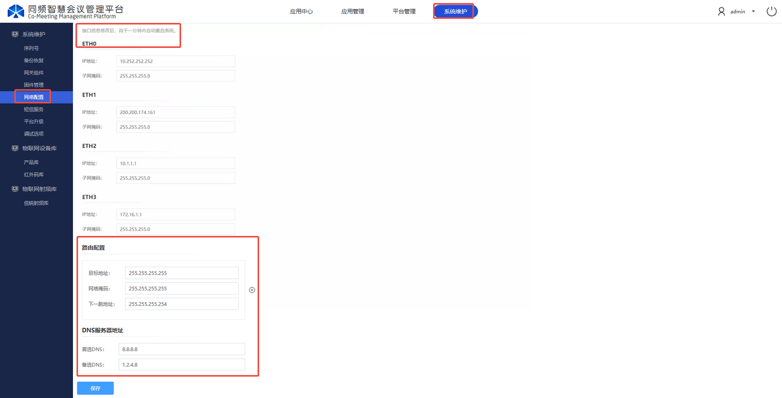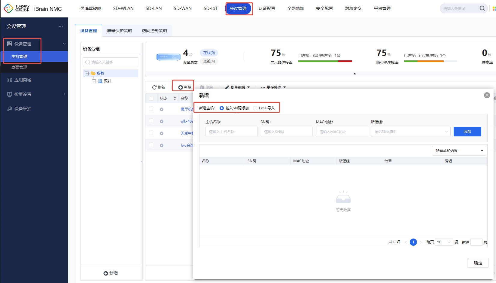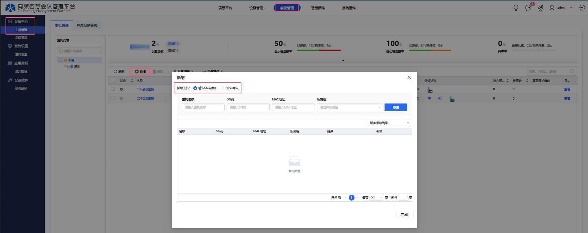 3、配置好IS-meeting私有云平台地址,接入客户内网,提前获取会议主机的SN和mac地址列表,导入私有云平台,修改设备名称,根据之前的网络规划完成会议主机上联有线网络和投屏WiFi的相关开局配置;