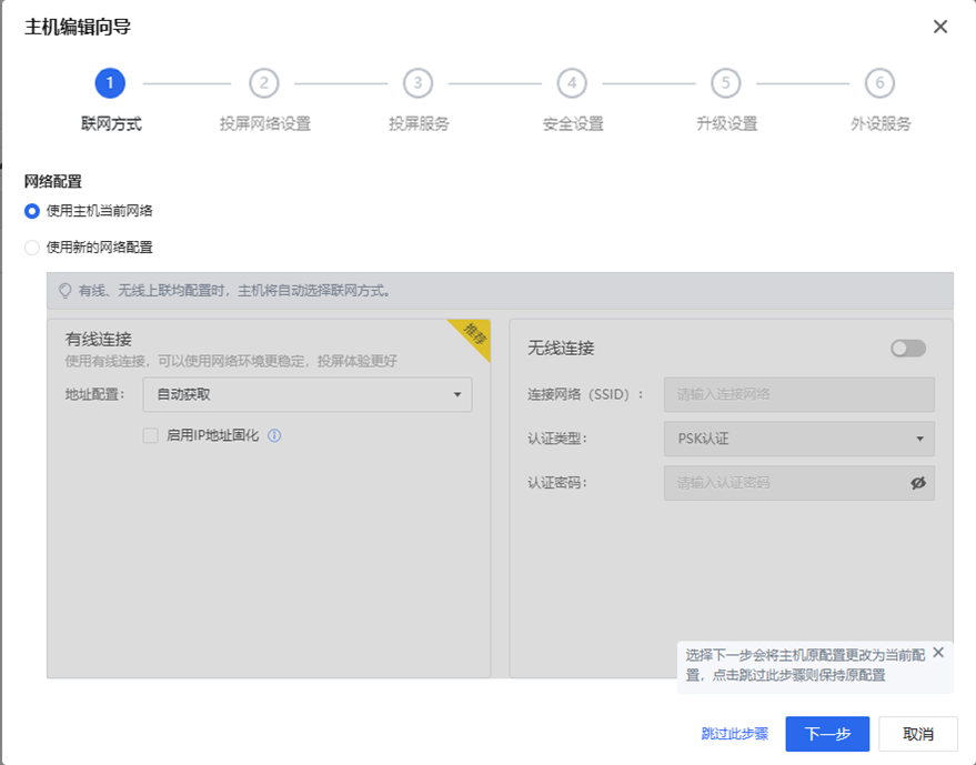1、客户原来的有线、无线网络不做改动,在会议室有线环境接入会议主机,规划好会议主机的有线上联环境,确保无线投屏终端和会议主机有线网段能够互相访问和会议主机的外网访问权限;严禁会议主机单设备、不连接客户有线上联网络进行使用;