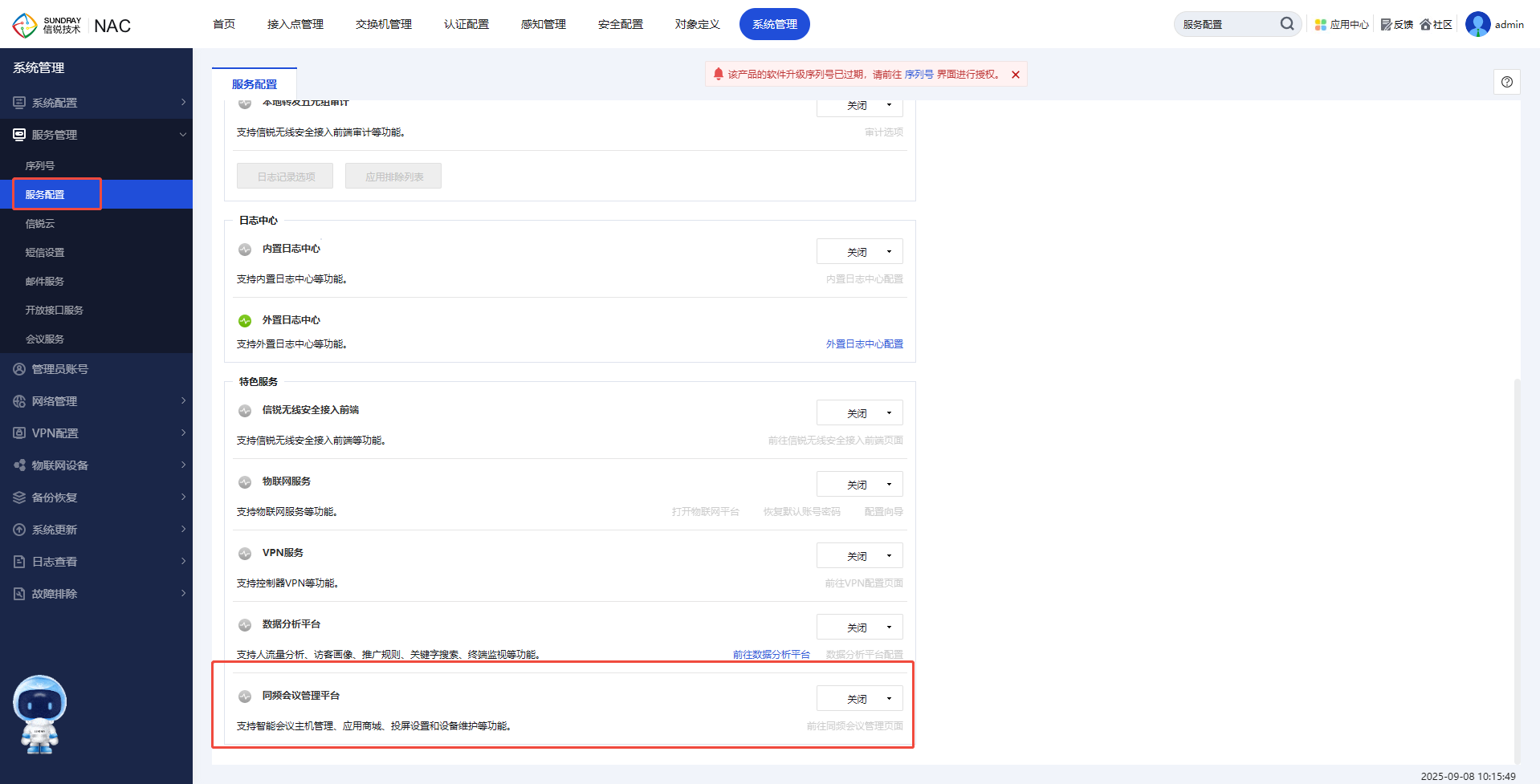 同时支持在NMC/NAC无线控制器上开启会议管理服务,最大支持管理20台会议主机(无线控制器必须为实体控制器,不支持虚拟机。无线控制器的磁盘不小于128GB、内存不小于4GB)