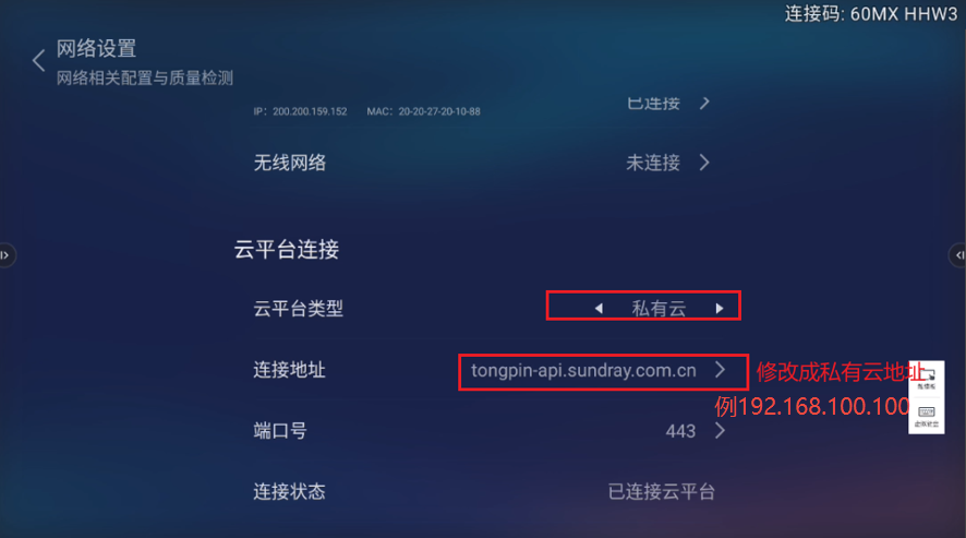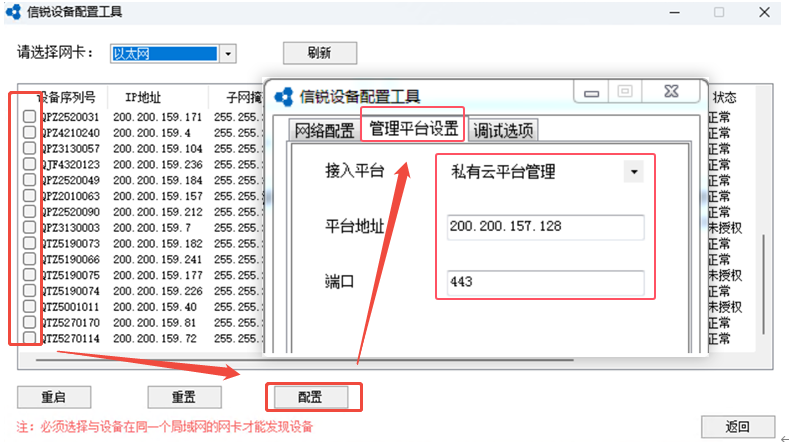 4、使用物联网网关配置工具同二层扫描出来所有的会议主机,批量配置私有云平台地址和端口,或者本地使用随心笔或者鼠标单个配置会议主机私有云平台地址和端口
