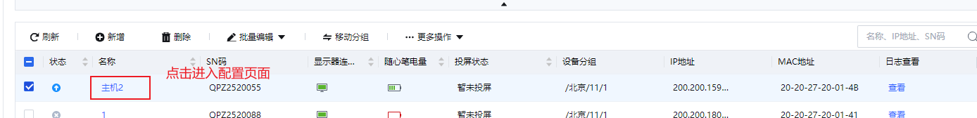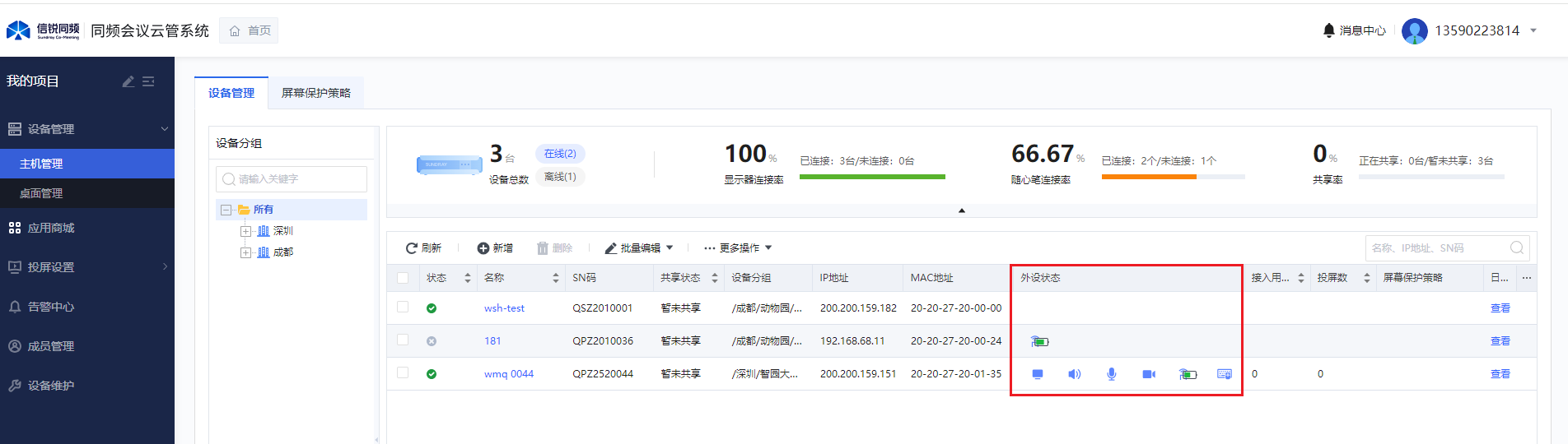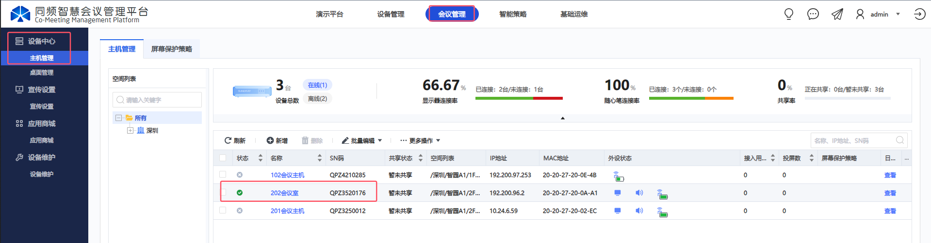 设备完成添加上云之后,可以看到设备在线/离线状态、显示屏连接情况、随心笔连接情况、随心笔电量情况、会议主机投屏情况
