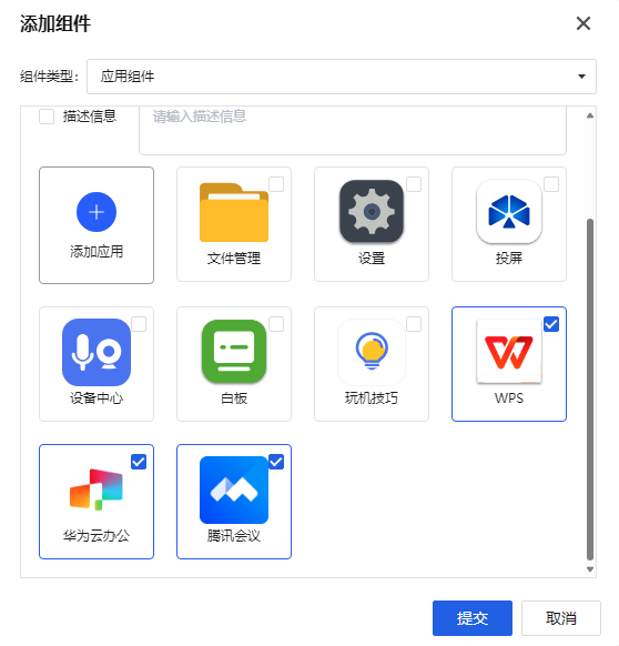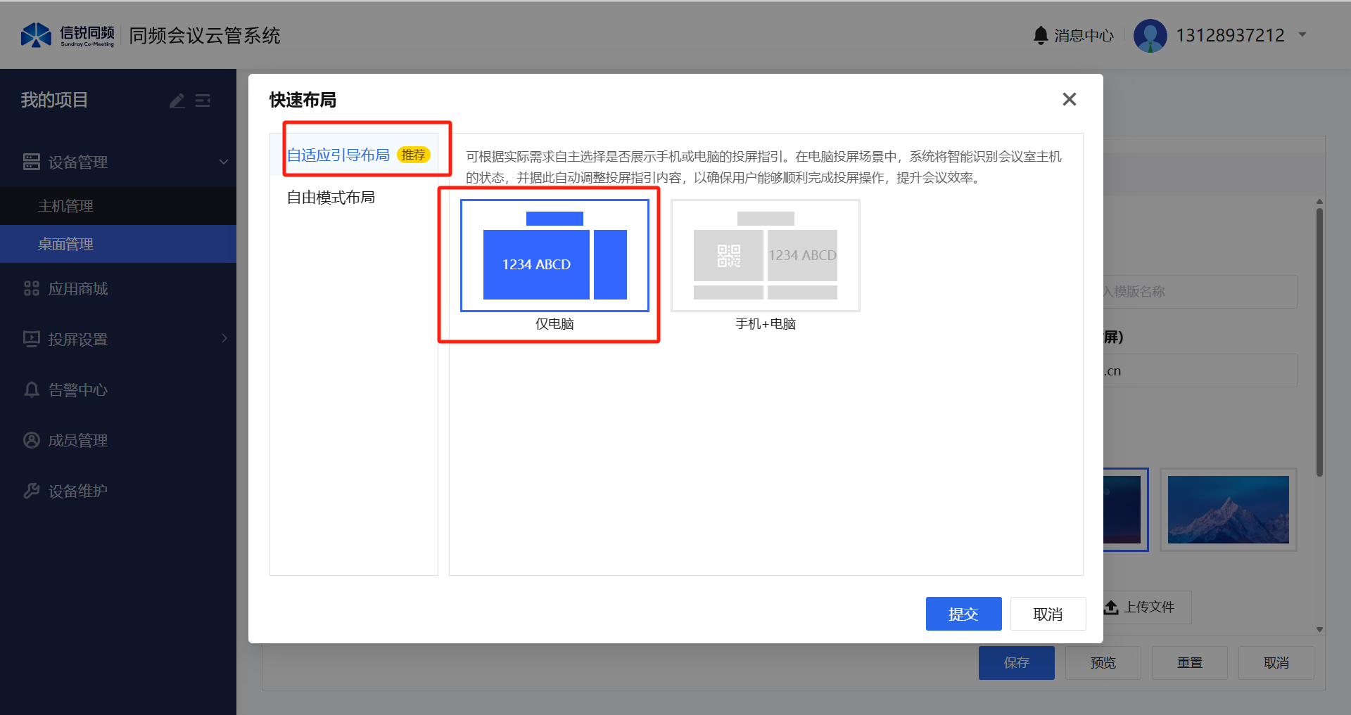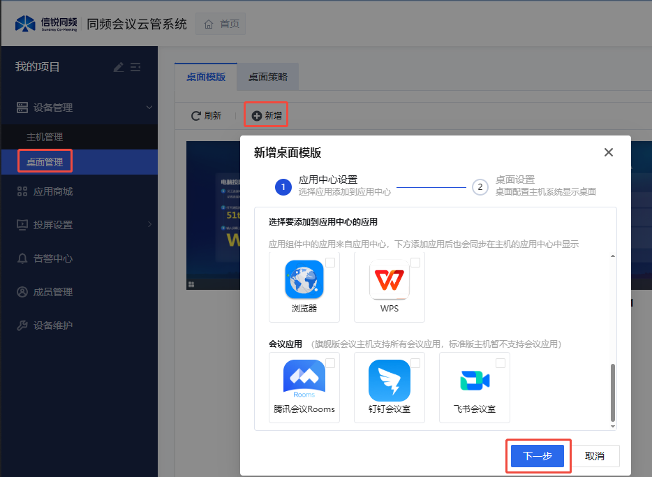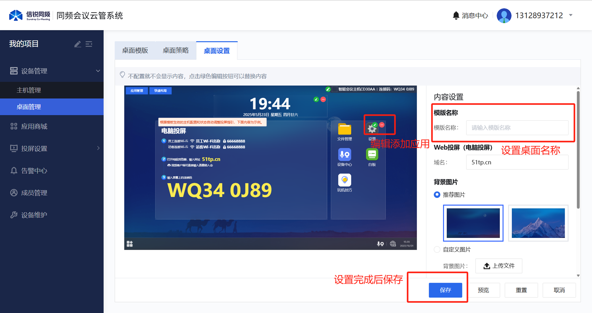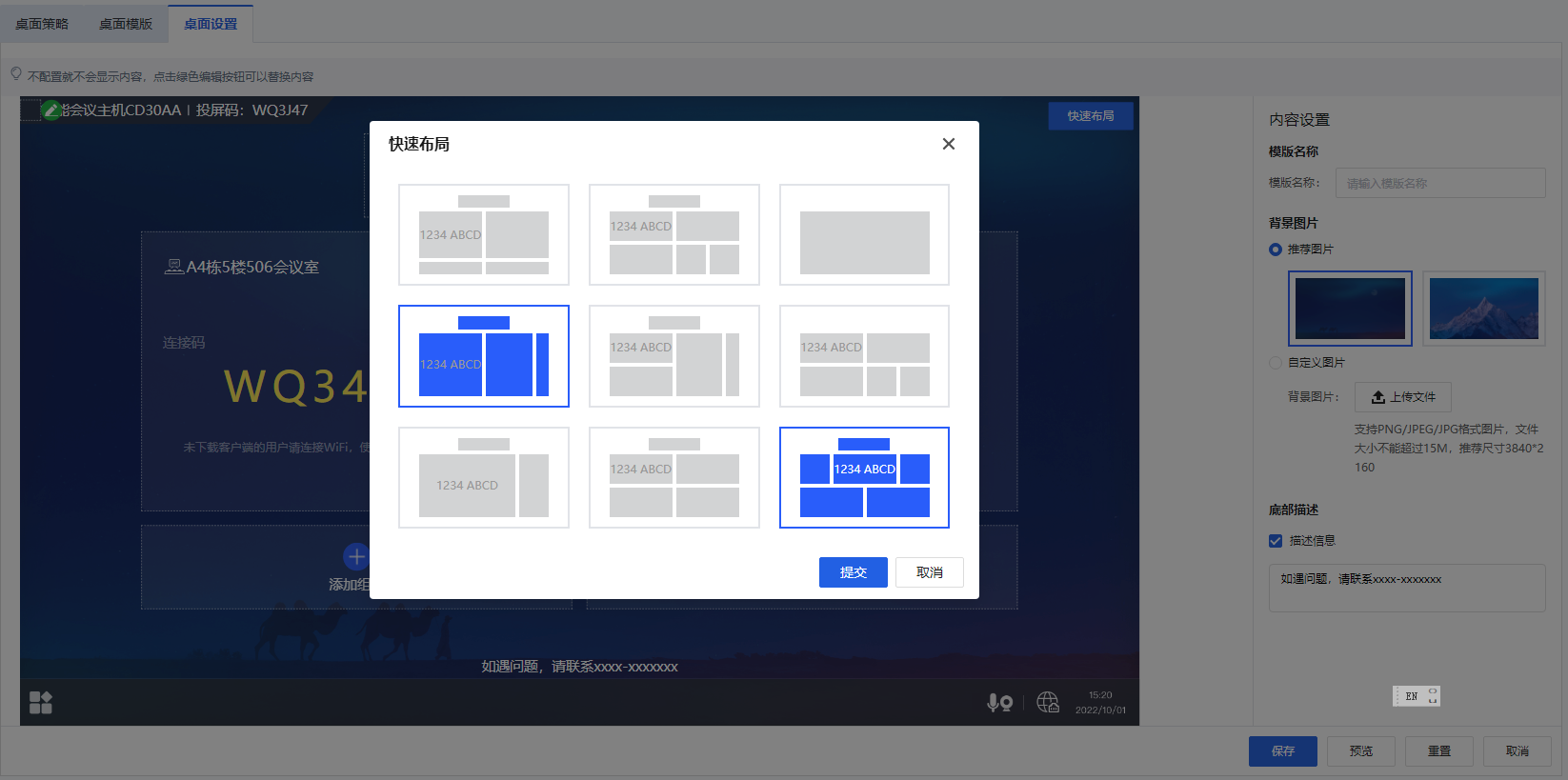 会议主机上线后可以统一配置桌面模板,配置投屏引导页的布局,配置会议主机支持的应用(需要旗舰版主机)