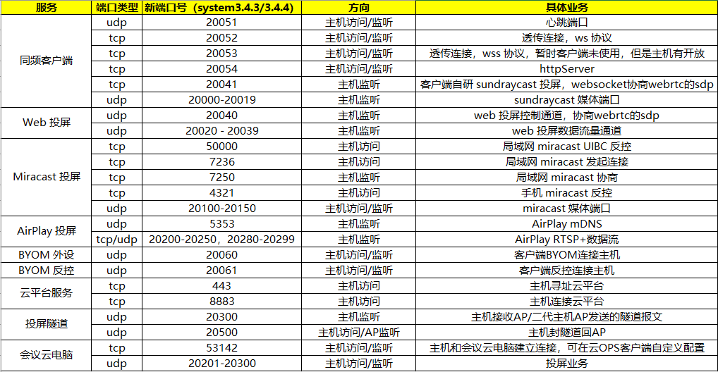 2、内部员工和访客网络权限放通事宜(放通投屏终端到会议主机的ip、端口)
