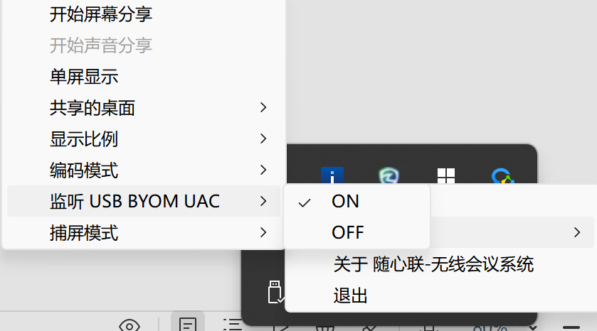 2、如通过typeA接入到电脑,则需要在托盘处右键手动打开高级功能>监听 USB BYOM UAC,勾选ON。
