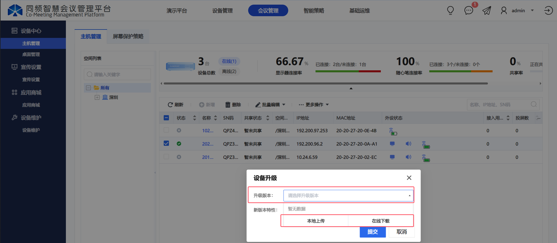 在私有云平台上,查看设备状态,确认会议主机版本是否为最新,若不为最新则需更新到最新版本。点击“更多操作-升级”,可以选择升级版本,支持本地上传和在线下载功能,下发升级任务,让会议主机升级到最新版本。(正在共享的会议主机会等待无人共享时才会进行升级操作)