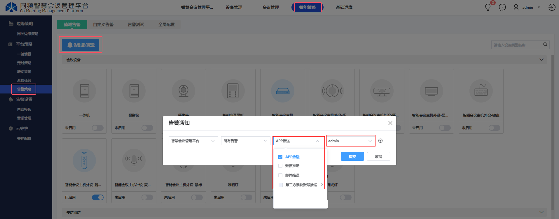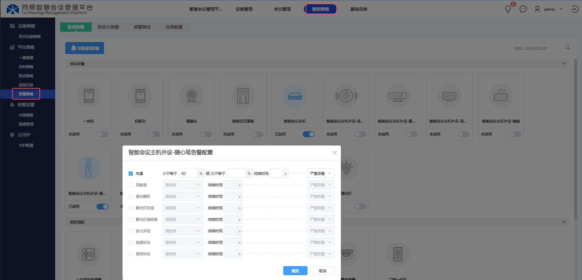 1、在智能策略-告警策略中可以配置各类设备的告警字段