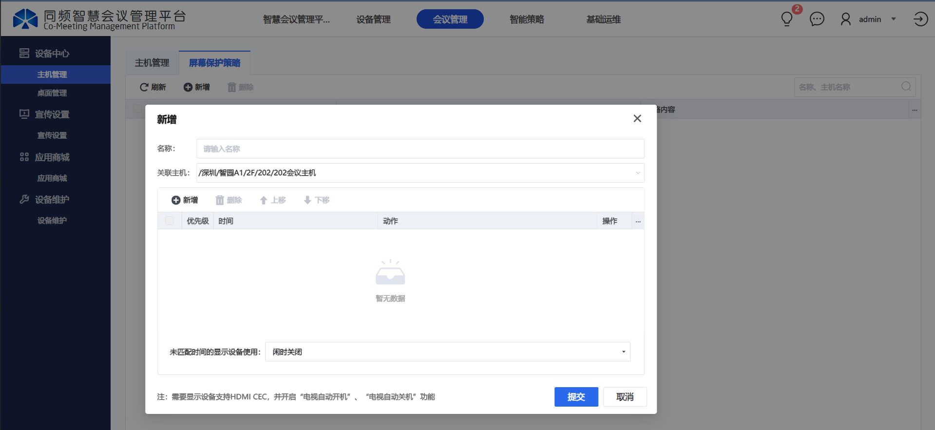 会议主机上线之后,支持配置屏幕保护策略对连接的显示屏进行熄屏/亮屏操作即闲时关闭功能。(显示器必须支持HDMI CEC控制)