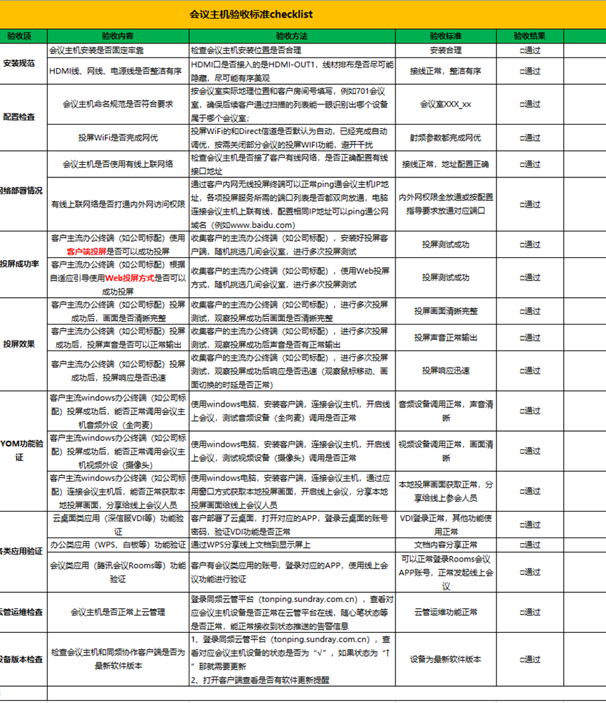 完成上述会议主机交付动作之后,可以根据以下表格的checklist项进行一一核对,确认设备功能交付是否完备,项目是否具备验收条件: