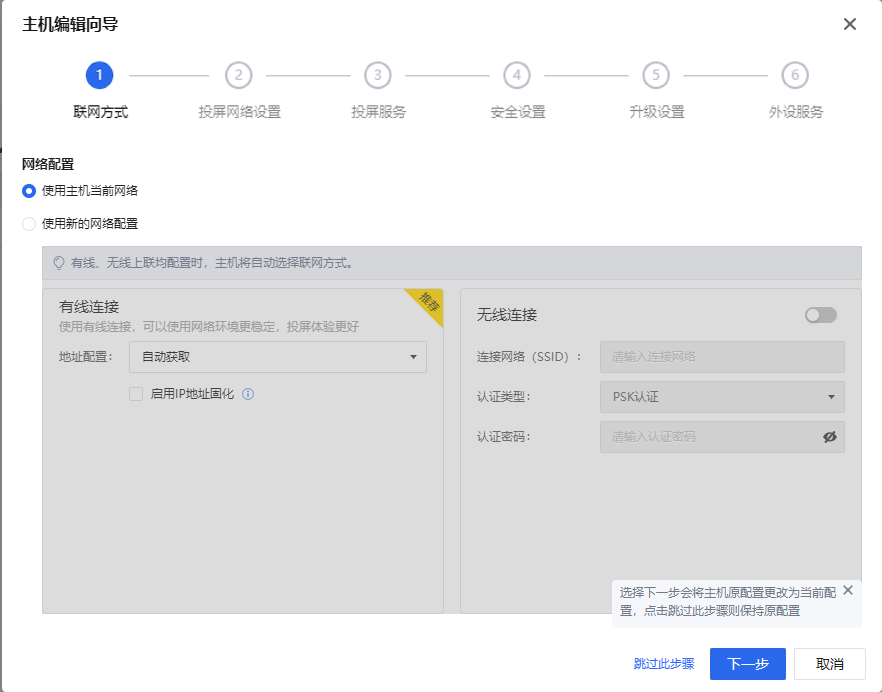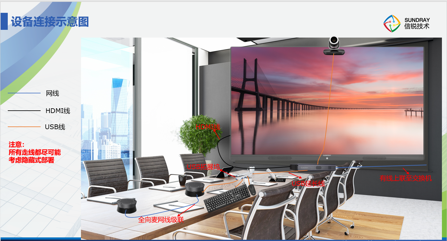 1、客户原来的有线、无线网络不做改动,在会议室有线环境接入会议主机,规划好会议主机的有线上联环境(必须),确保无线投屏终端和会议主机有线网段能够互相访问和会议主机的外网访问权限;严禁会议主机单设备、不连接客户有线上联网络进行使用;
