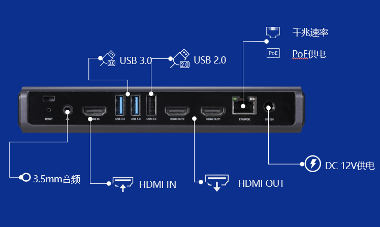 USB3.0 host,支持5V/1A输出,支持鼠标、键盘、全向麦、摄像头等外设