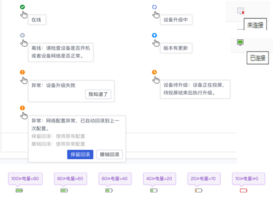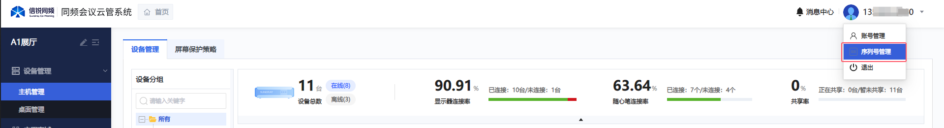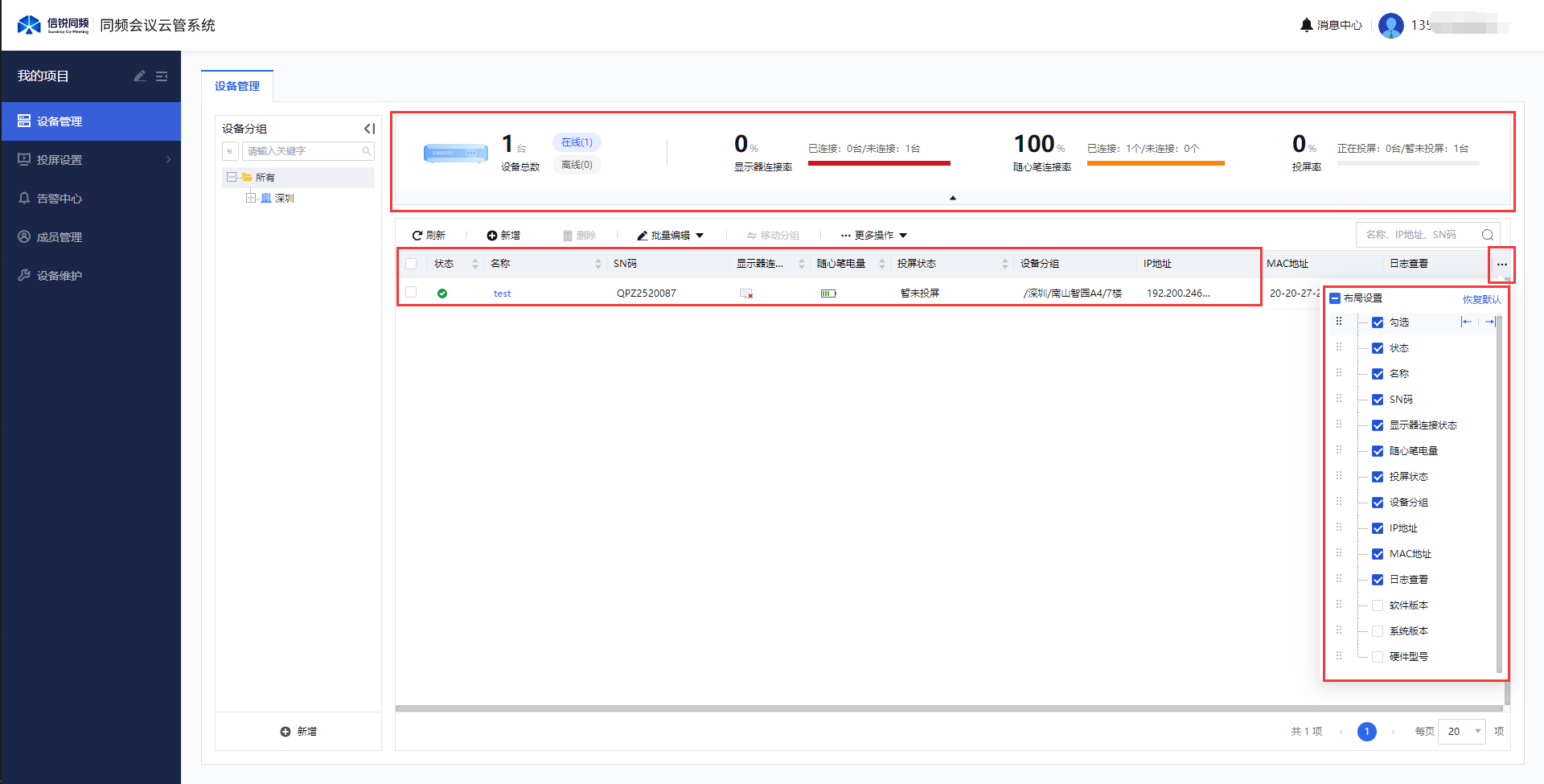 设备完成添加上云之后,可以看到设备在线/离线状态、显示屏连接情况、随心笔连接情况、随心笔电量情况、会议主机投屏情况