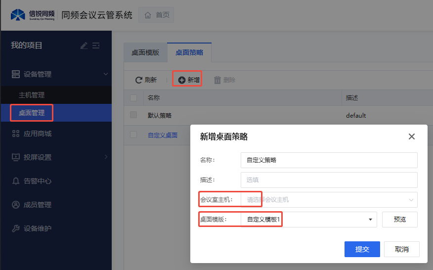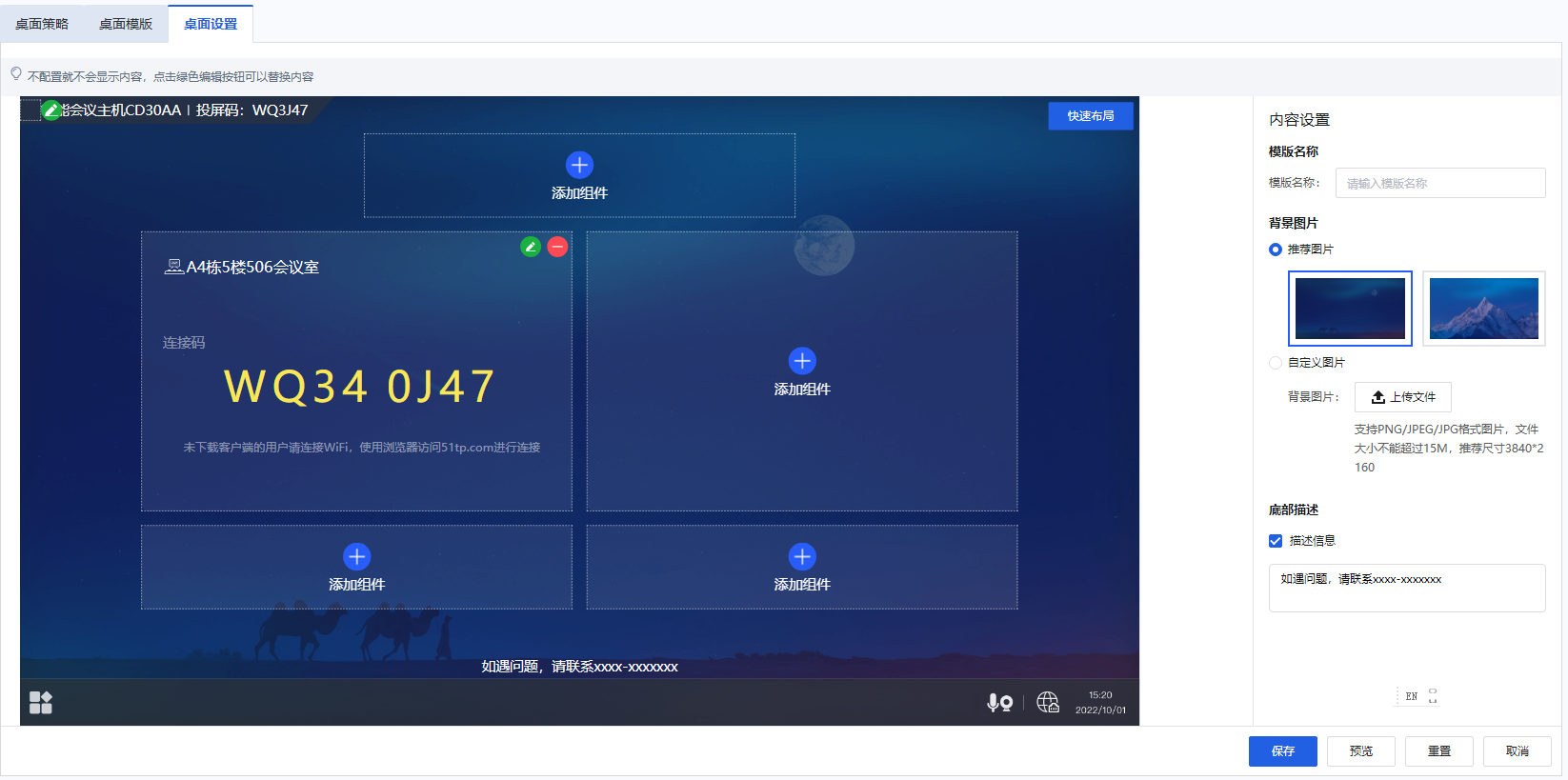 会议主机上线后可以统一配置桌面模板,配置投屏引导页的布局,配置会议主机支持的应用(需要旗舰版主机)