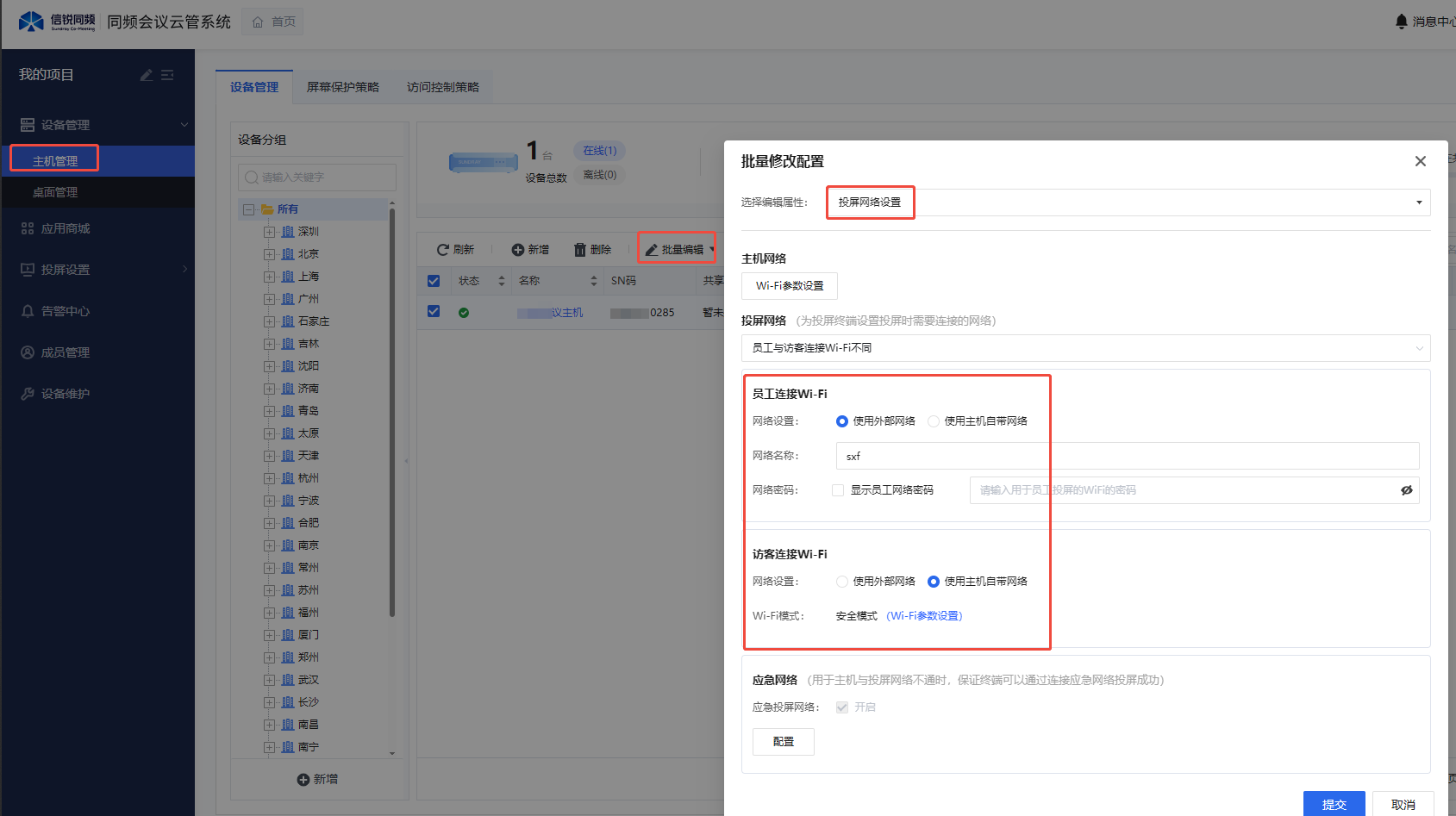 3、协助客户注册小信云账号,在云管平台导入授权序列号(必须,不上云则开机7天之后设备锁定无法使用),添加设备,修改设备名称,根据之前的网络规划完成会议主机上联有线网络和投屏WiFi的相关开局配置;
