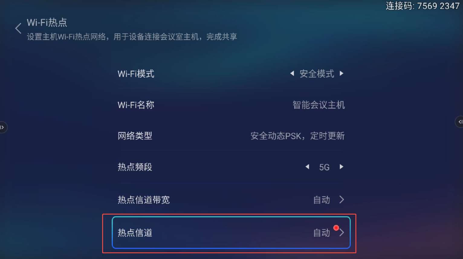 会议主机网优主要调整的是投屏WiFi的信道和Direct信道,默认使用5G。投屏WiFi信道和Direct信道出厂默认是自动,会议主机在上电启动时和点击“信道调优”配置时会根据当前环境自动选择最佳信道。