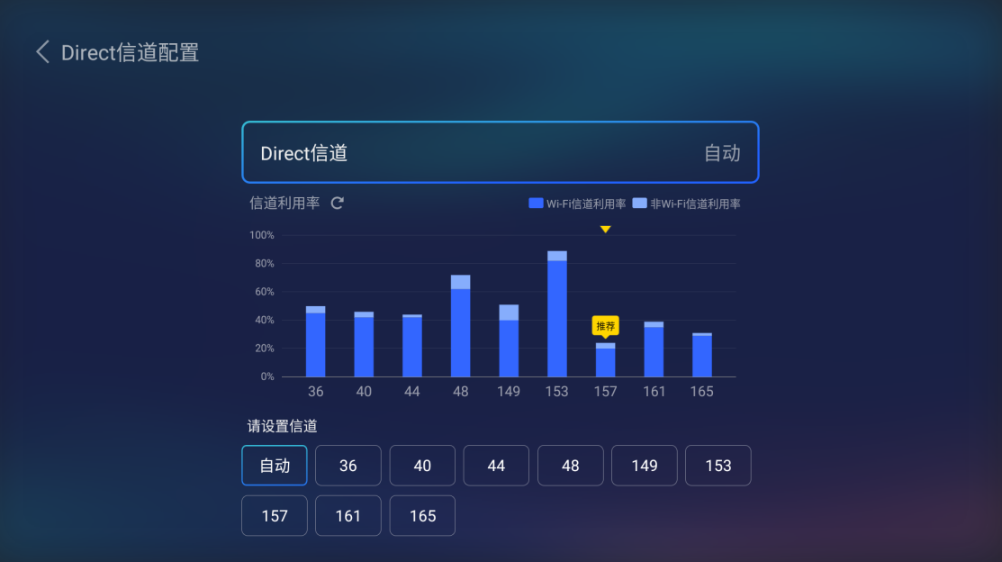 6.同理在主机设置-投屏服务里面,可以调整WIFI-Direct的信道。提供了信道利用率图表,显示当前环境5g频段各个信道的使用情况,用户可利用此图表选择最佳信道。