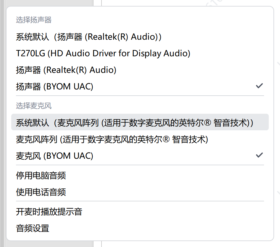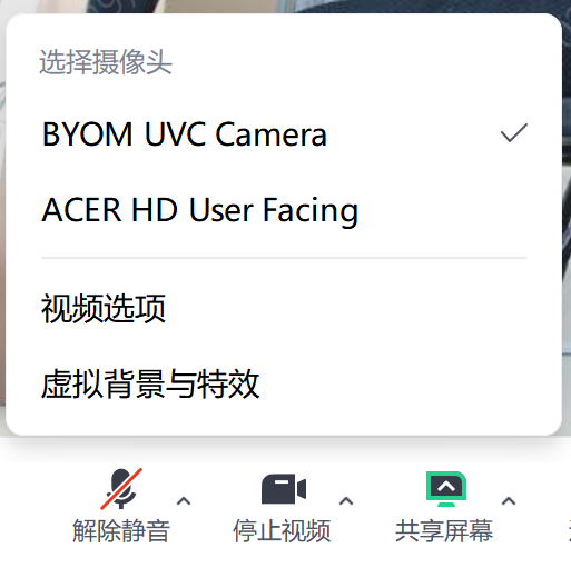 1、支持摄像头、麦克风和扬声器,以腾讯会议为例,投屏成功后,扬声器和麦克风选择设备 BYOM UAC,即可使用主机端接入的扬声器和麦克风。摄像头选择 BYOM UAC Camera,即可使用主机端接入的摄像头。