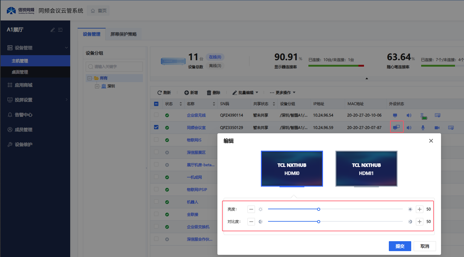 会议主机上线之后可以查看每个会议室的外设连接状态,同时点击对应外设图标可以配置对应外设的相关参数