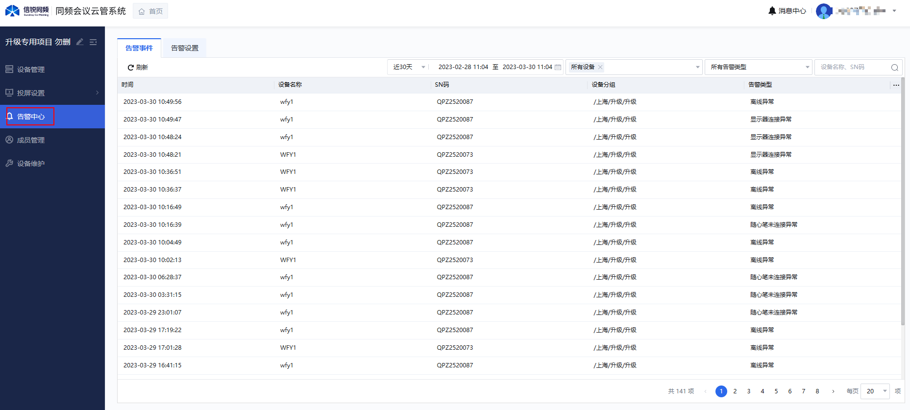1、在告警中心可以看到该账号所有设备的异常告警事件