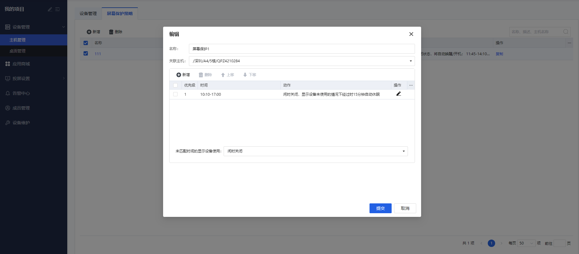 会议主机上线之后,支持配置屏幕保护策略对连接的显示屏进行熄屏/亮屏操作即闲时关闭功能。(显示器必须支持HDMI CEC控制)