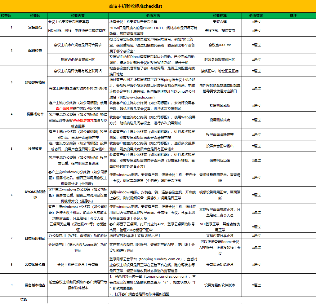 完成上述会议主机交付动作之后,可以根据以下表格的checklist项进行一一核对,确认设备功能交付是否完备,项目是否具备验收条件: