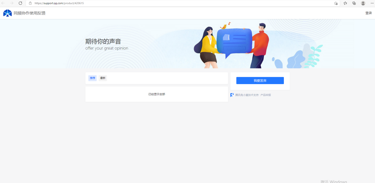 功能:在安装客户端的pc已连接外网的情况下,点击意见反馈按钮,弹出二次确认询问框,确认后页面跳转至https://support.qq.com/product/420615链接页面,访问同频协作使用反馈平台,可在此进行意见反馈。