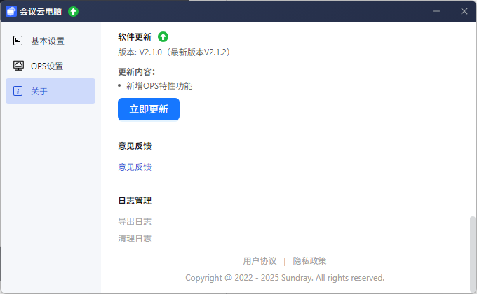 功能:通过软件更新、意见反馈、日志管理三个模块,来展示客户端当前软件版本号与最新版本号,收集用户意见,导出、清理客户端日志。