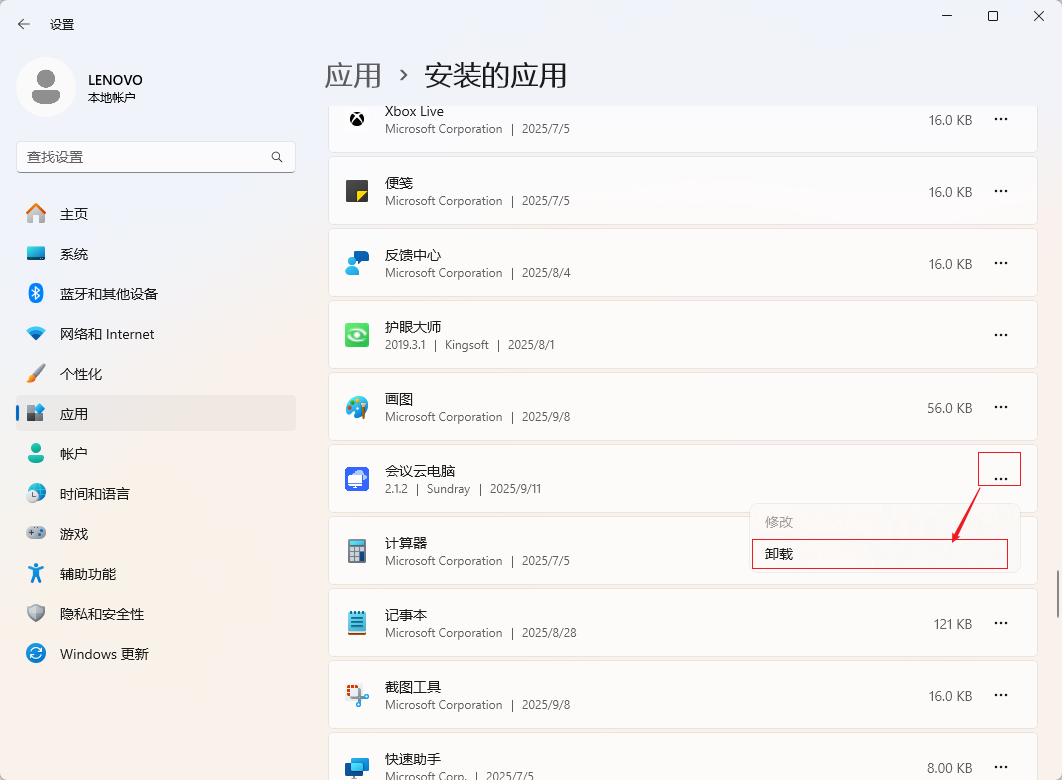 在安装会议云电脑客户端设置处的应用与功能处,选择会议云电脑客户端 ,鼠标点击“卸载”按钮,即可卸载会议云电脑客户端。