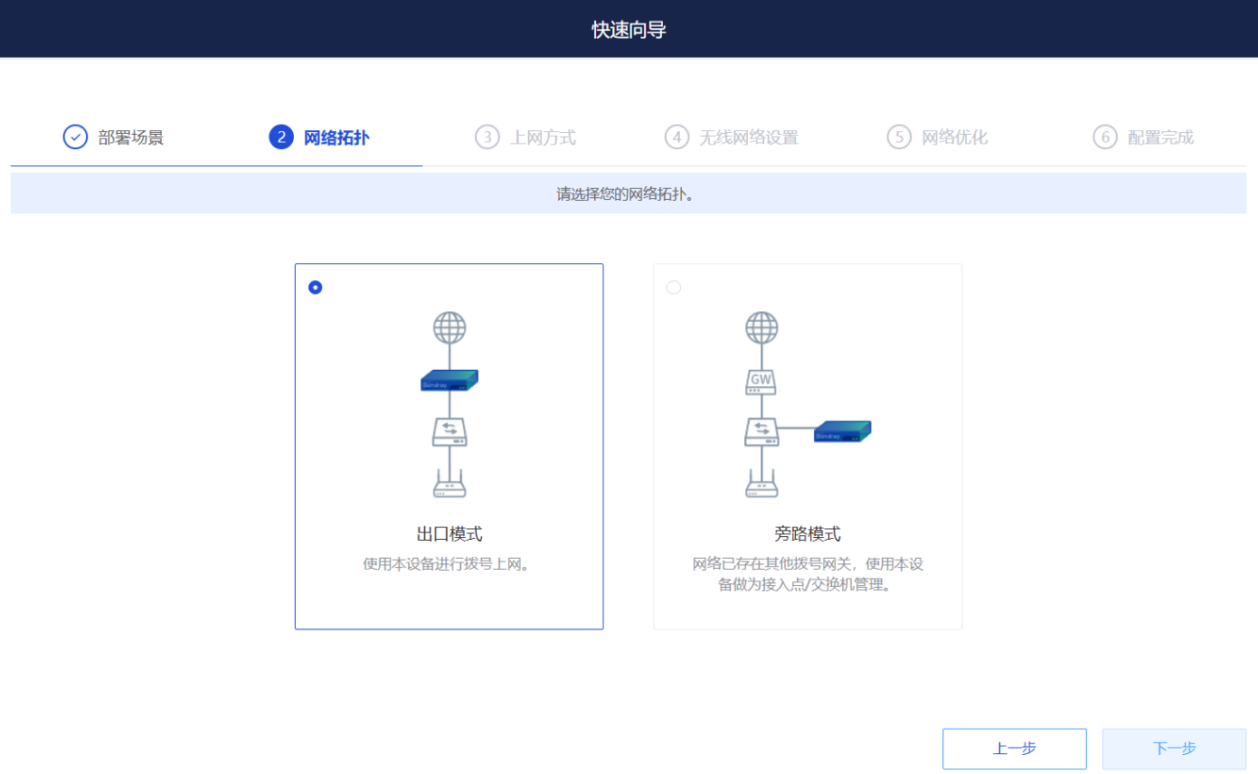 2、网络拓扑选择“出口模式”,然后点击下一步;